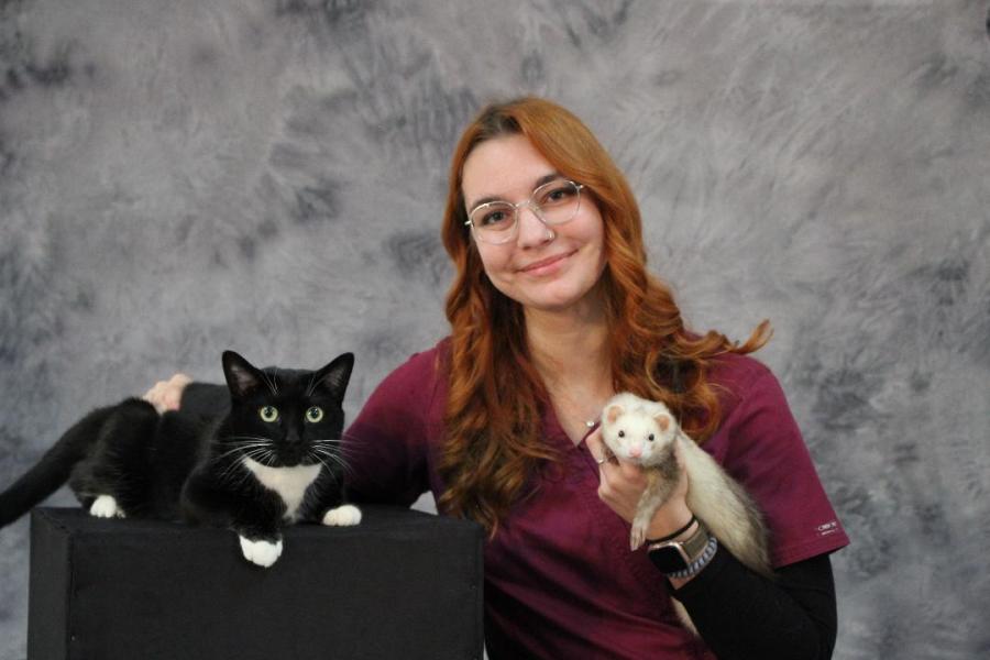 Caroline a commencé en 2019 comme réceptionniste à temps plein suite à ses études en théâtres. À l’origine, c’était une situation qui devait être temporaire le temps de trouver un emploi dans son domaine. Par contre, elle a tellement aimé travailler ici qu’elle a plutôt décidé de se réorienter et retourner aux études en techniques de santé animale. Elle est présentement dans sa 3e et dernière année et travaille avec nous à temps partiel, autant à l’arrière avec les techniciennes qu’à la réception. Sa partie préférée du travail est la chirurgie. Sa race préférée est le teckel et elle a hâte de graduer afin de pouvoir adopter son petit Tony. Elle a présentement un chat domestique de 5 ans, Ozzie, et un furet de 2 ans, Groot.