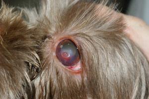 Un ulcère cornéen résulte d’une perte de continuité au niveau de l’épithélium cornéen, qui peut être accompagné d’une perte plus ou moins importante du stroma cornéen sous-jacent. C’est une condition douloureuse et qui sera donc associée la plupart du temps à un blépharospasme (clignement des paupières) et une augmentation de la production de larmes.