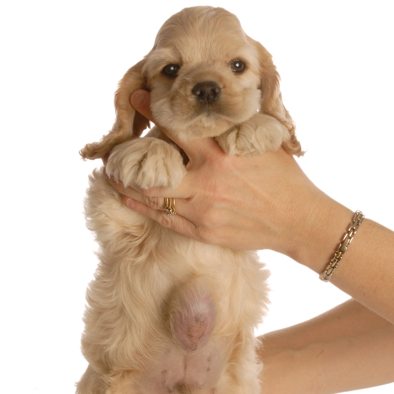 La hernie ombilicale peut contenir du gras, de l'omentum, qui emmagasine le gras, nourrit les organes et apporte une protection physique ou encore des structures ombilicales importantes comme des anses intestinales. Une strangulation des structures peut se produire si l'anneau ombilicale est assez petit ou qu'elles se retrouvent coincées à l'intérieur c'est pourquoi le traitement recommandé demeure la chirurgie. Si la hernie est dure, chaude ou encore irréductible, il est important d'aller en chirurgie assez rapidement, car une suspicion de strangulation ou encore d'obstruction intestinale est forte. Si toutefois le contenu est plutôt mou et réductible alors la correction de l'hernie peut se faire lors de la chirurgie de stérilisation.