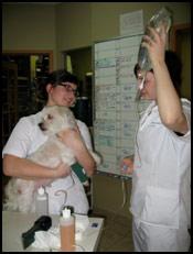 L'image montre une technicienne en santé animale tenant la patte de l'animal et pesant sur sa veine pour la faire gonfler et la rendre plus visible.