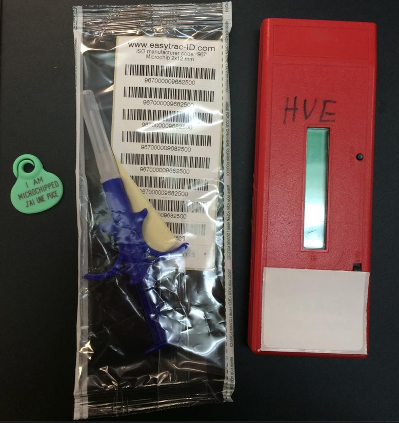 (Médaille pour informer que l'animale possède une micropuce, la seringue comprenant la micropuce et ses étiquettes d'identification qui ressemble à un code barre avec une série de chiffre unique, puis le lecteur de micropuce)