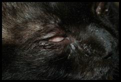 Un entropion est une inversion de la paupière ou d’une partie de celle-ci ; la paupière roule vers l’intérieur, c’est-à-dire vers la cornée. La condition peut toucher une seule paupière ou affecter les quatre paupières dans le pire des cas. C’est, plus souvent qu’autrement, une condition congénitale (l’animal nait avec la condition; généralement diagnostiquée avant l’âge de 1 an) bien qu’on puisse rencontrer certaines conditions acquises (le problème s’est développé suite à un trouble oculaire). Les races qui sont les plus souvent affectées par ce problème sont : les races brachycéphales comme les Carlins, Boston terriers, Pékinois, Boxers; certaines races géantes présentant un surplus de peau faciale comme les Saint-huberts et les Saint-bernards par exemple et les races à multiples replis cutanés faciaux comme les Shar peis et les Chow chows.