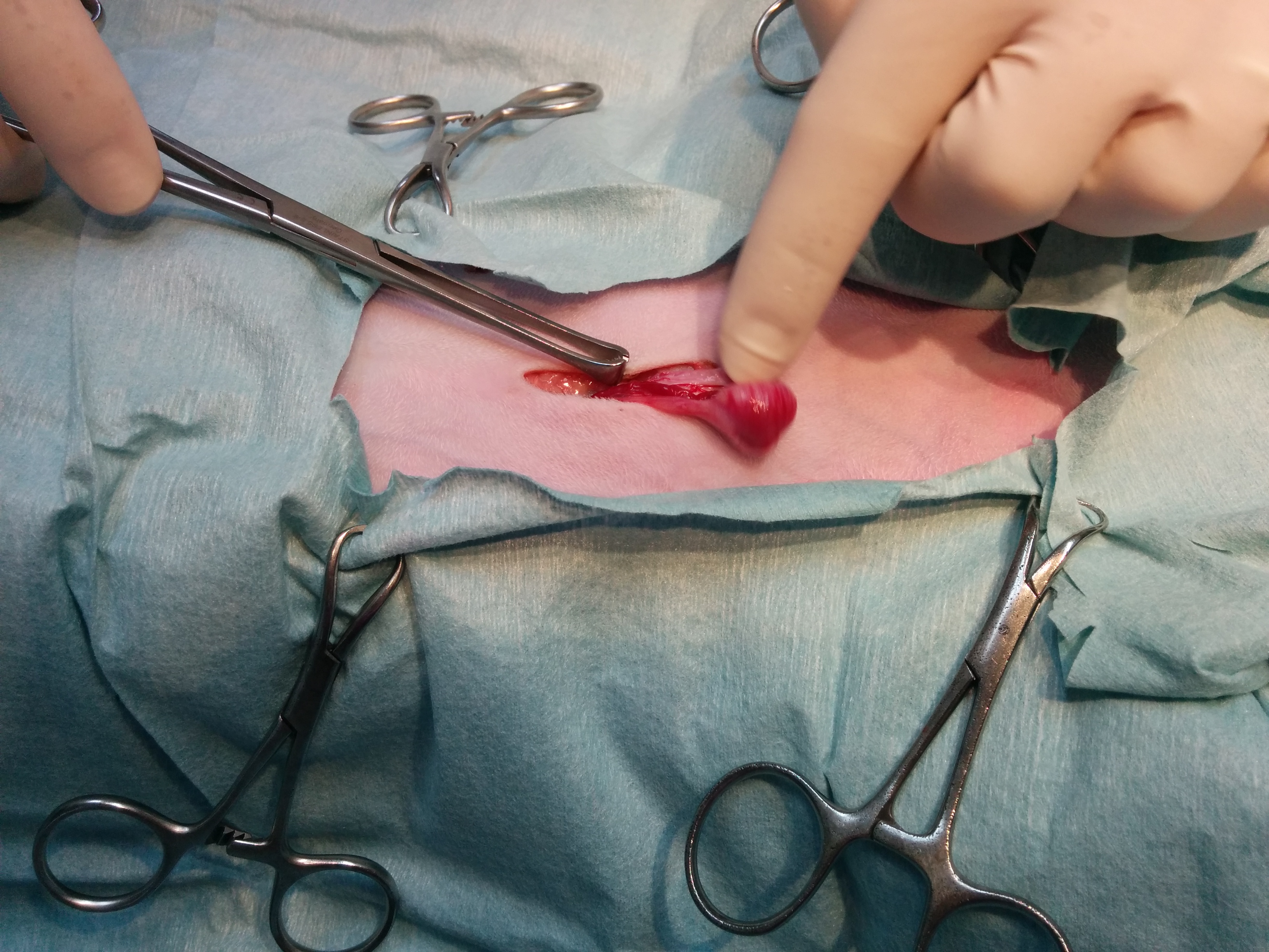 Lors de la chirurgie, le vétérinaire doit trouver le testicule si celui-ci n'est pas palpable au niveau inguinal et donc, explorer la cavité abdominale et procéder a la castration des deux testicules.