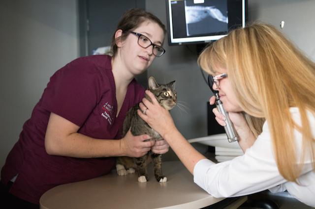 Selon la sévérité de l’ectropion, l’œil peut présenter certaines anomalies : un écoulement séreux chronique avec coloration des poils au coin de l’œil, un écoulement mucoïde ou purulent, une rougeur de l’œil, une enflure de la conjonctive et parfois même un ulcère cornéen. Selon l’apparence de l’œil, le vétérinaire voudra faire des tests ophtalmologiques afin d’évaluer l’intégrité de la cornée et de l’œil en général. Si par exemple, il y a présence de conjonctivite ou d’un ulcère cornéen, la condition devra être adressée de manière prioritaire. Divers médicaments ou modalités pourront être prescrits selon la condition : du gel lubrifiant pour les yeux, un onguent antibiotique, une collerette, parfois des médicaments oraux. Ensuite, il faudra corriger le problème palpébral si jugé nécessaire.